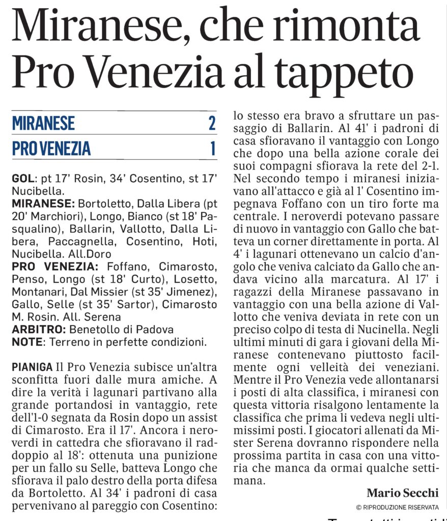 ⚽⚽⚽ Dopo esser passati in vantaggio nel primo tempo i ragazzi di mister Serena subiscono fuori casa la rimonta della Miranese che pareggia verso la fine del primo tempo e segna il gol vittoria nel secondo. Con questa sconfitta la Prima Squadra vede allontanarsi la testa della classifica, ma il campionato è ancora lungo.