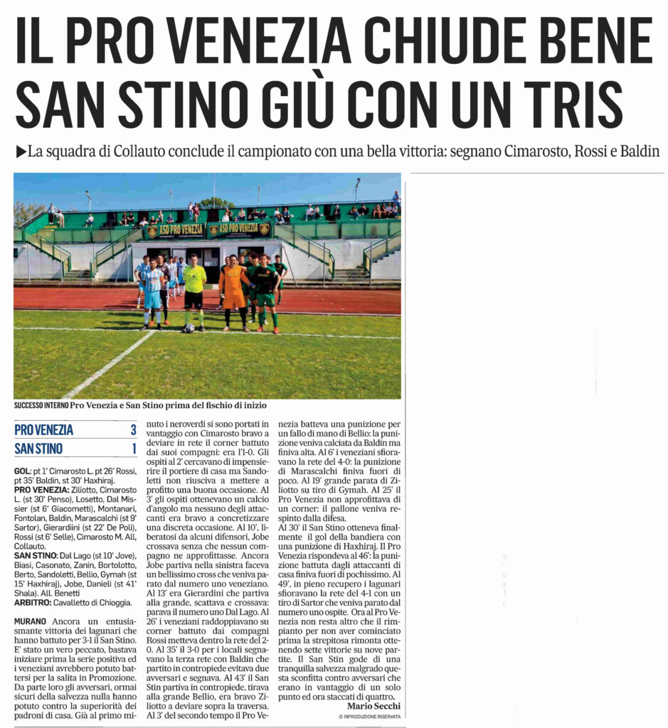 ⚽⚽⚽ 10!!! Termina il campionato per la Prima Squadra con un’altra vittoria questa volta in casa per 3-1 (Cimarosto, Rossi e Baldin) contro San Stino. Con questo risultato i ragazzi di mister Collauto hanno portato a 10 i risultati utili consecutivi (8 vittorie e 2 pareggi) concludendo il campionato al 6° posto.