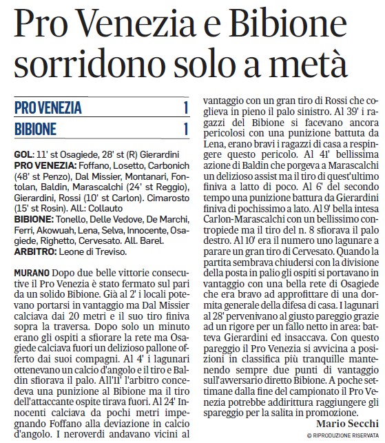 ⚽⚽⚽ Finisce col risultato di 1-1 la gara interna della Prima Squadra contro Bibione. Dopo essere passati in svantaggio all’inizio del secondo tempo i ragazzi di mister Collauto raggiungevano il pareggio su rigore a metà ripresa. Con questo risultato la Prima Squadra mantiene il 9° posto in classifica con 33 punti superando Calcio Marghera sconfitto in casa.